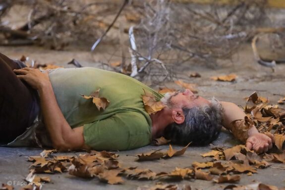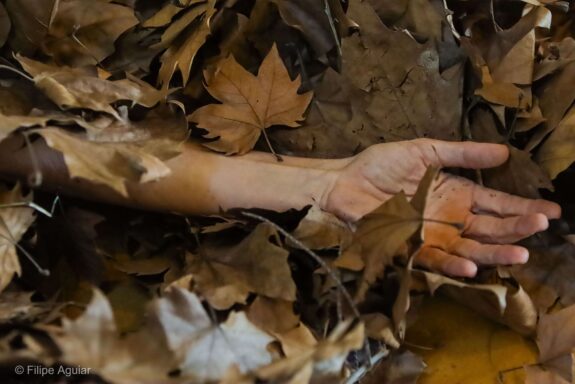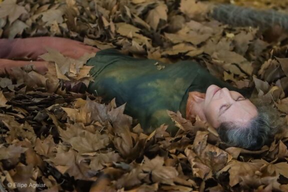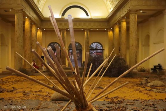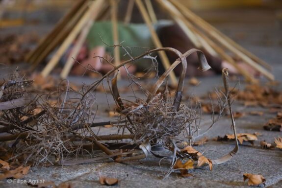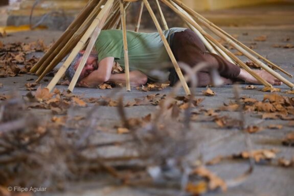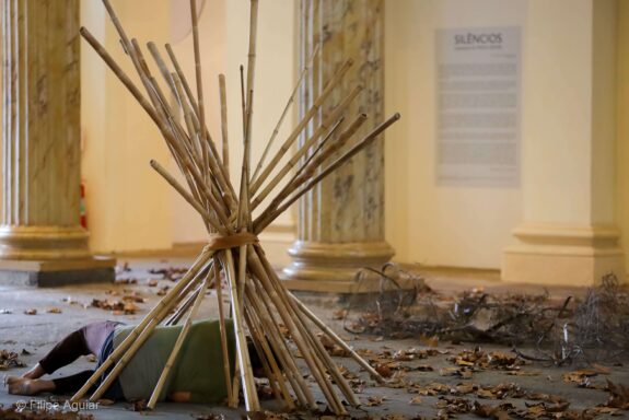 O trabalho central, homônimo ao título da mostra, é uma instalação movente ativada pelo corpo de três bailarinos intérpretes: a própria artista, Betina Guelmann e Toni Rodrigues. A cada visita, o espectador poderá encontrar uma nova configuração da instalação, que passa a ser montada de uma maneira diferente a cada ativação. Os três moldam o silêncio através da mobilidade de seus corpos e dos elementos cênicos – galhos, folhas secas, bambus em equilíbrio instável – que fazem o espaço, exteriorizando seus silêncios internos. Tornar-se galho ou folha, virar pedra, assim, exercita possibilidades de silenciar.