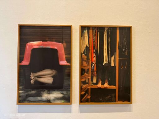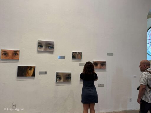 Em Hoje, a artista nos convida a meditar, concentrando-nos no agora, tarefa tão difícil quanto urgente num mundo em aceleração desenfreada. As fotografias da série Vontade de ficar pra dentro apontam um movimento dentro-fora, tal qual Ângela Pralini, ao enunciar os seus abismos de silêncio enquanto “o dia corre lá fora à toa”2. Já a série Atravessamento ontológico traz fotografias de olhos de seres humanos e mais-que-humanos, inserindo o espectador também no foco. A presença dos espelhos abre possibilidades de atravessamento: quem sabe confrontar a própria imagem refletida possibilita um olhar para dentro?