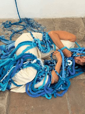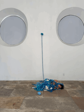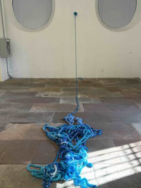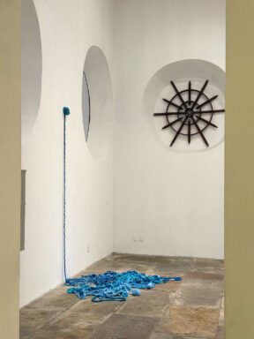 Por fim, Umbilical materializa a experiência do tempo: o trabalho foi realizado pela artista enquanto acompanhava a mãe em tratamento de hemodiálise. O cordão azul que liga mãe e filha foi tecido ao longo de quatro longos anos, apontando que “nunca a vida foi tão atual como hoje: por um triz é o futuro”3.